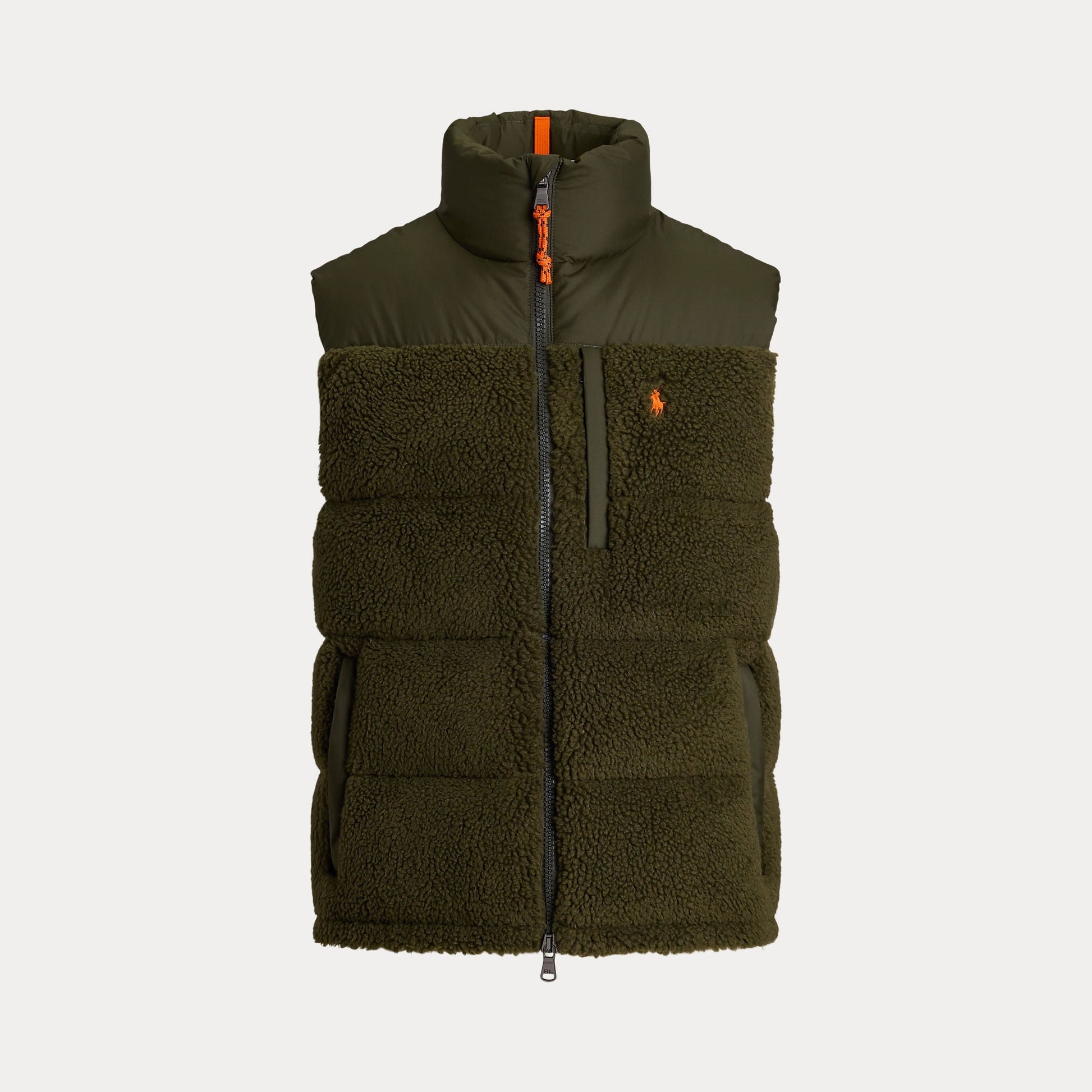 This vest is crafted from high-pile fleece and paneled with sleek ripstop for a modern take on texture. It is insulated with 650-fill-power down and finished with the iconic Polo Pony.