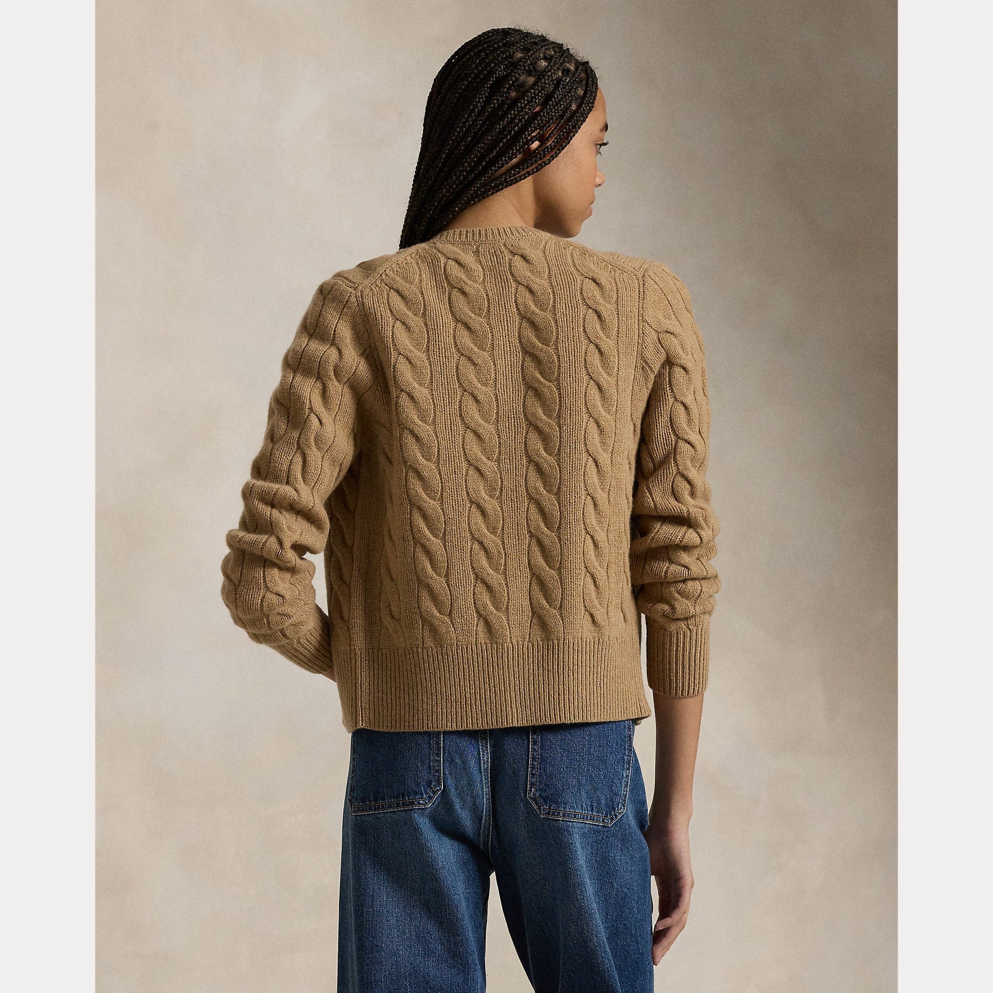 Made with a blend of Italian wool and cashmere for a soft hand and a fluid drape, this cable-knit cardigan with a seamless scalloped placket is accented by our signature embroidered Pony at the chest.