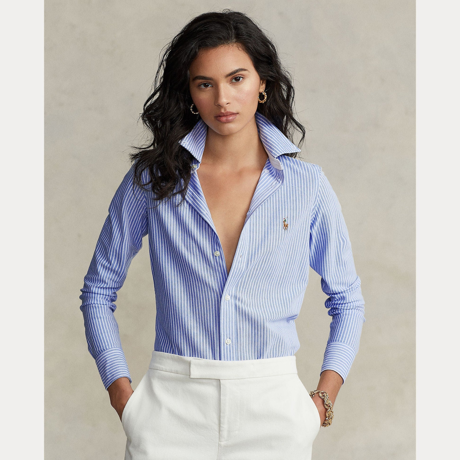 Although it takes its name from England's most famous academic institution, the oxford shirt has its origins on the backs of early British polo players, who wore shirts made from oxford cloth on the field and used pins to keep their collars in place during rigorous play. Over time, pins were replaced by buttons, and the oxford shirt became a staple of casual, prep-influenced style, and a signature element of the iconic Polo Ralph Lauren aesthetic. This breathable cotton piqué version combines the tailoring of an oxford with the comfort and ease of a Polo shirt, and is cut for a flattering slim fit.