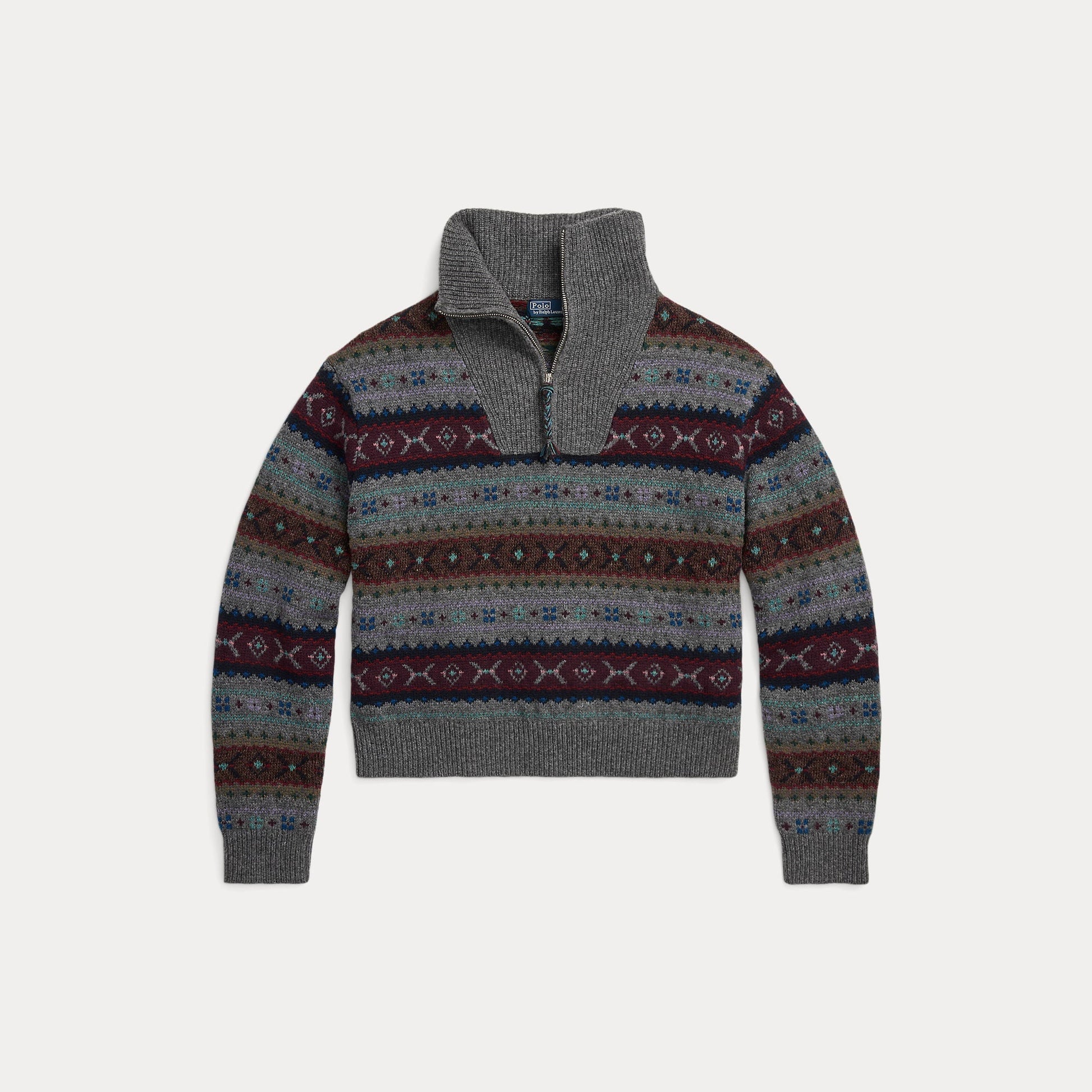 Rendered in soft wool, this jacquard-knit sweater merges a muted Fair Isle–inspired pattern with a wide rib-knit hem and a half-zip placket for a sporty Polo twist.