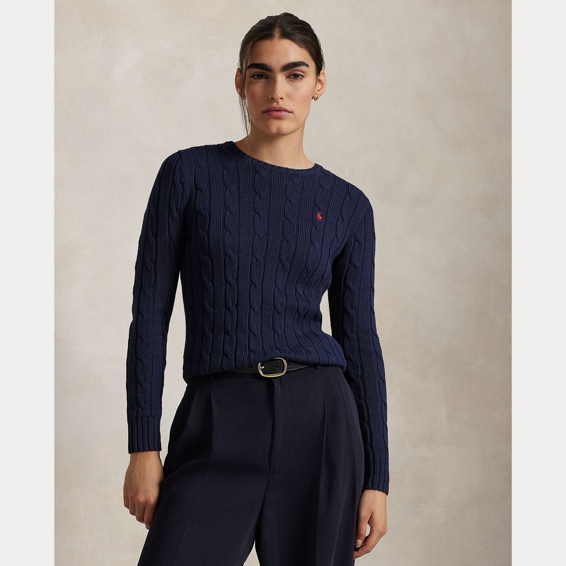 A Polo essential, this slim-fitting crewneck sweater is made with breathable cotton and showcases our signature cable-knit construction.