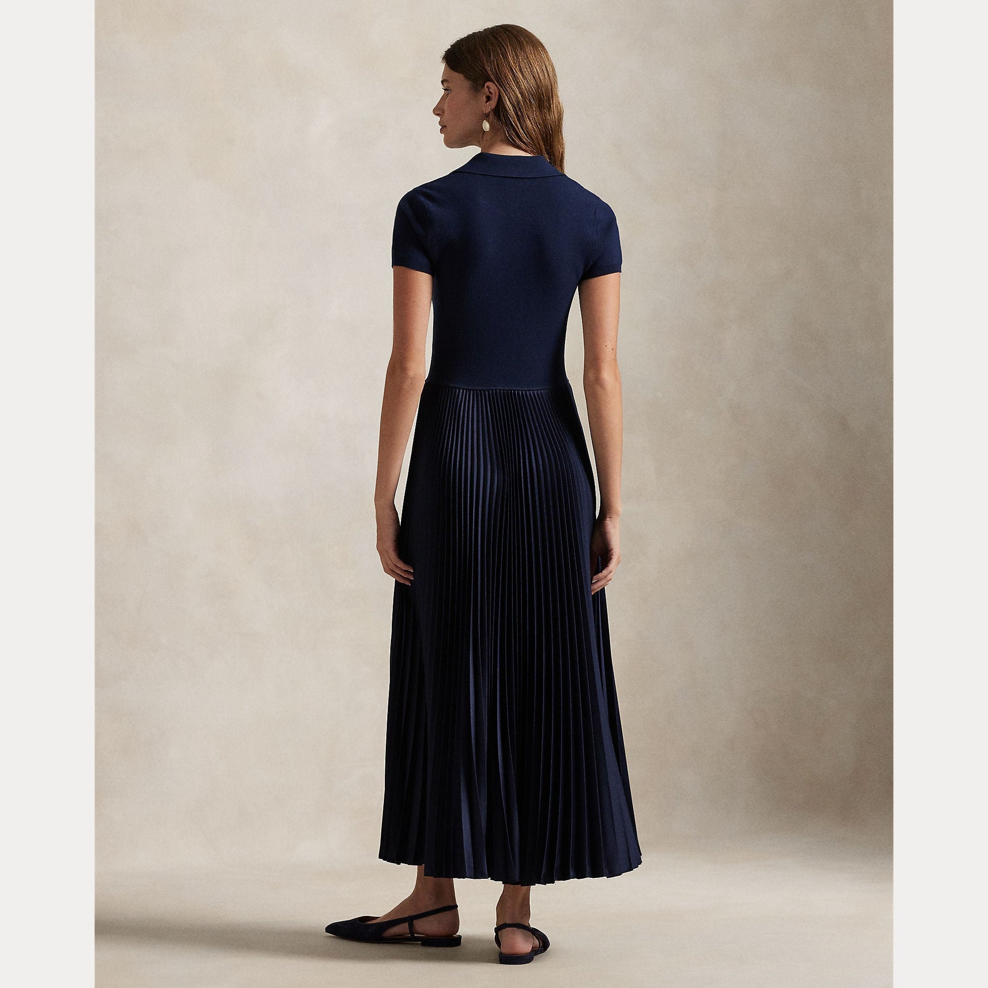 This dress merges a fitted Polo sweater bodice, complete with a flat-knit collar and buttoned half-placket, with a flowing sunburst pleated charmeuse skirt.