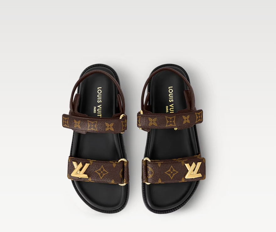 • Il sandalo basso LV Sunset reinterpreta il classico modello comodo con il tocco di stile di Louis Vuitton. La calzatura è realizzata nell'emblematica tela Monogram, con soletta anatomica per il massimo comfort. La creazione si distingue per i pratici cinturini imbottiti con velcro, uno dei quali è impreziosito dalle iniziali della Maison in metallo dorato, che ricordano l'iconica borsa Twist.