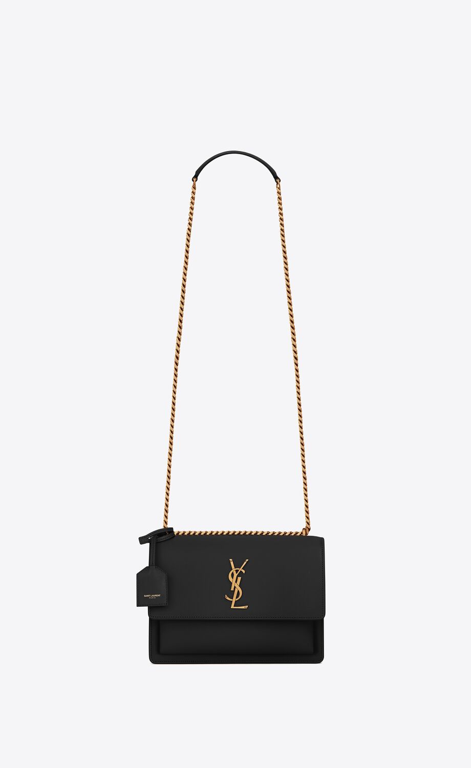 Monogram Saint Laurent bag with front flap, side gussets, chain and leather shoulder strap that can be worn crossbody or doubled on the shoulder, keychain with leather case and intertwined metal YSL initials.