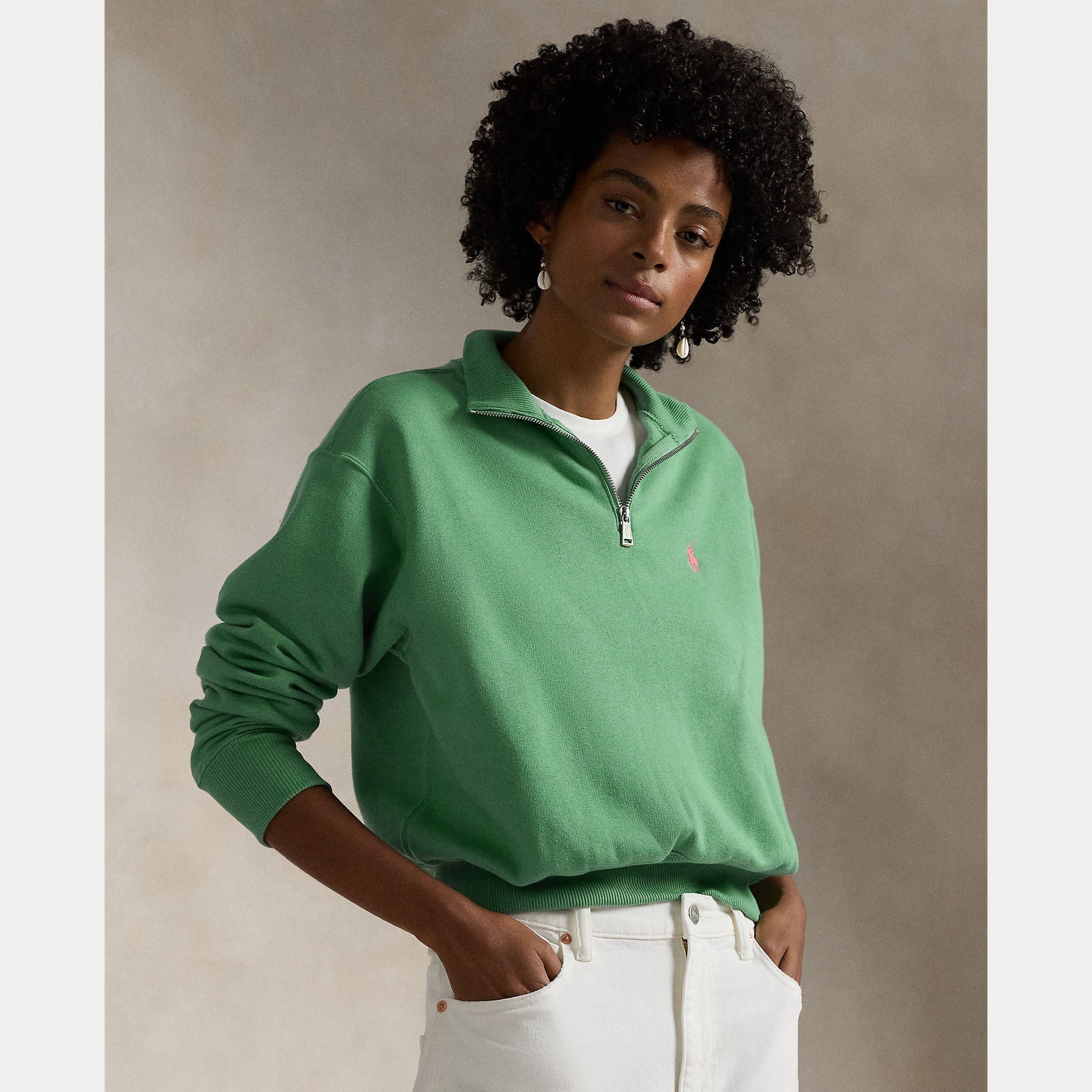 Washed for an even softer feel, this fleece quarter-zip pullover is designed for a relaxed silhouette and enhanced with ribbing at the collar, cuffs, and hem.