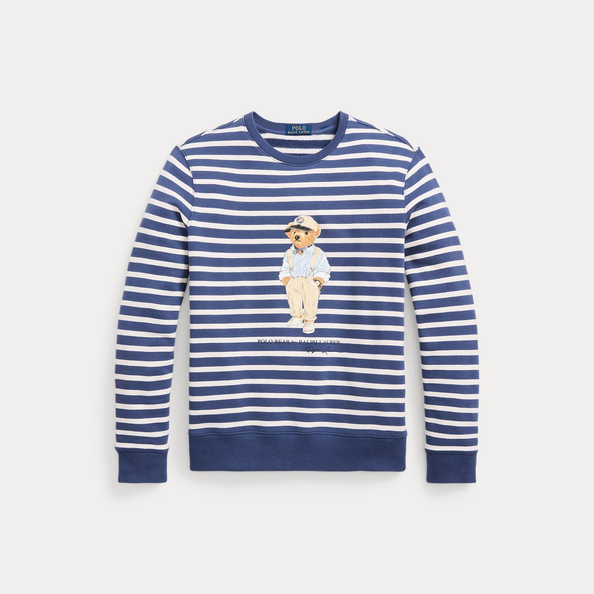 This striped sweatshirt is crafted with plush cotton-blend fleece and finished with our beloved mascot, the Polo Bear.