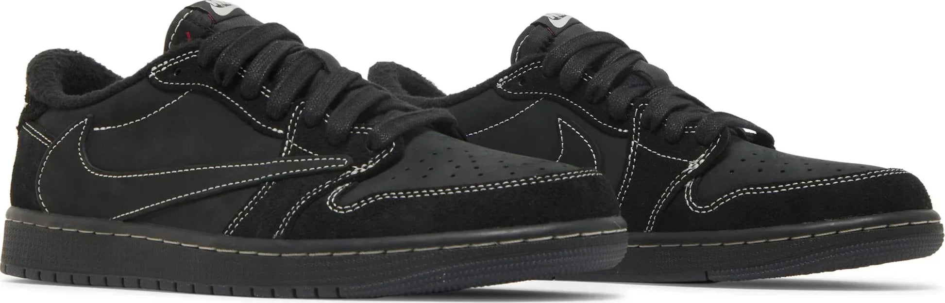 The silhouette returned with his signature backwards Nike Swoosh but with a new contrast stitch design. The all black nubuck sneakers feature a Nike Air logo on the tongue and an Air Jordan Wings logo on the right heel tab. Red, Black, and White/Black laces are included and an embroidered Bee is located on the heel tab of the left sneaker inspired by Travis’ daughter, Stormi.